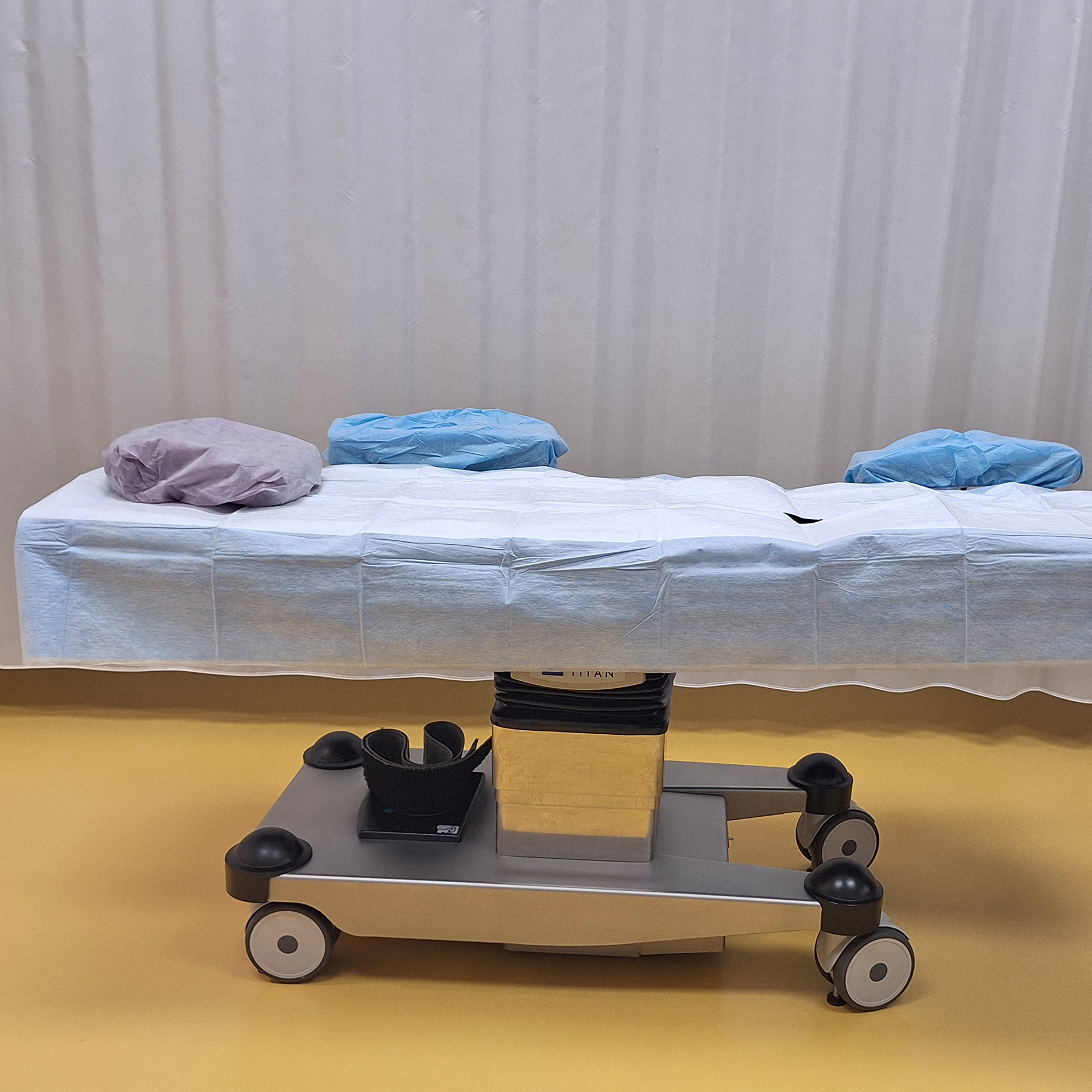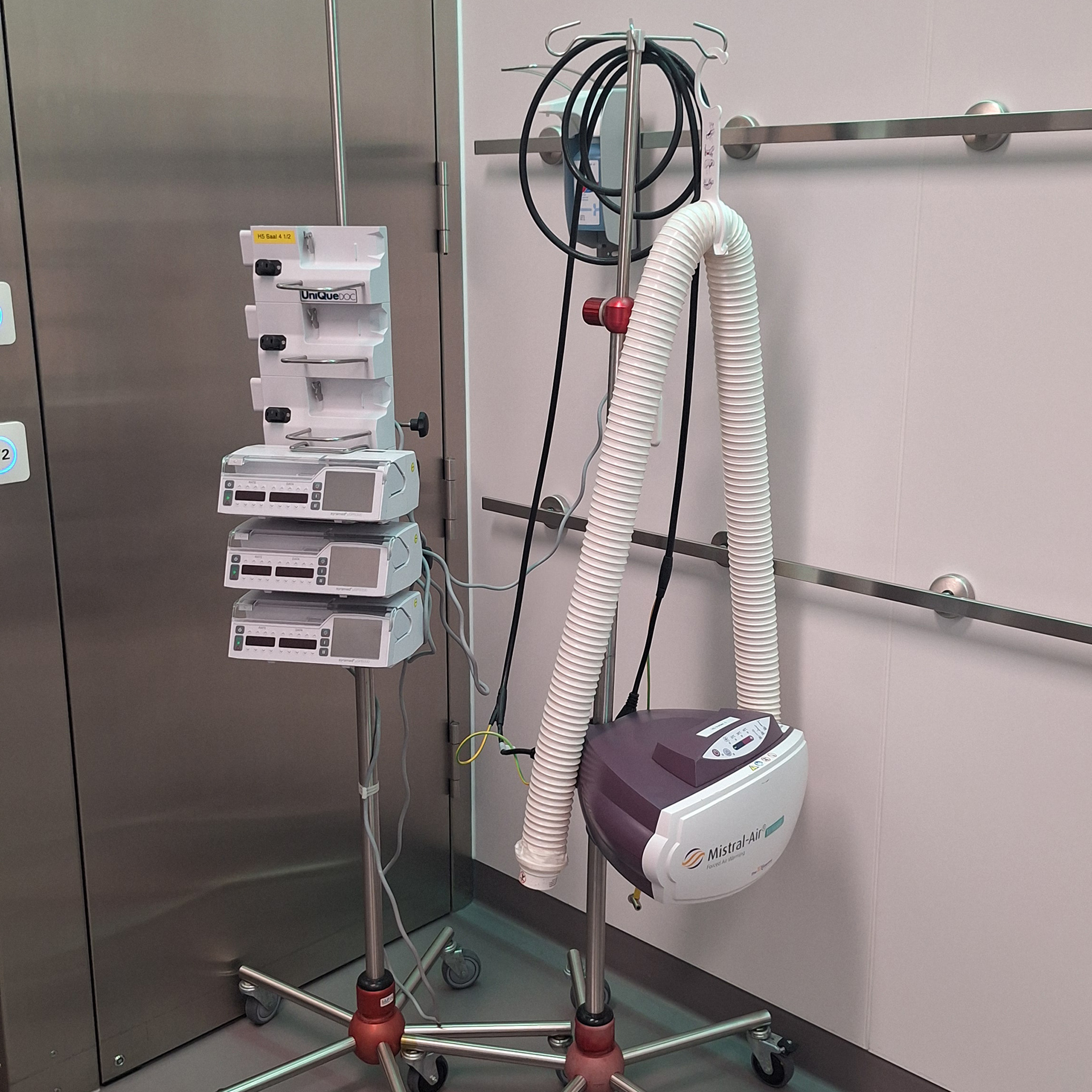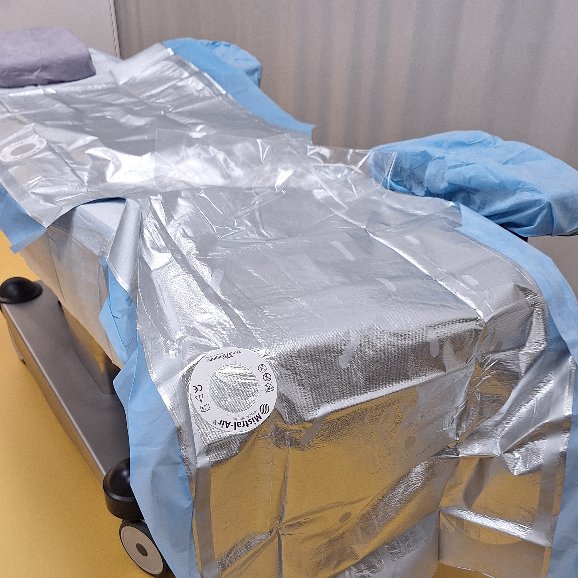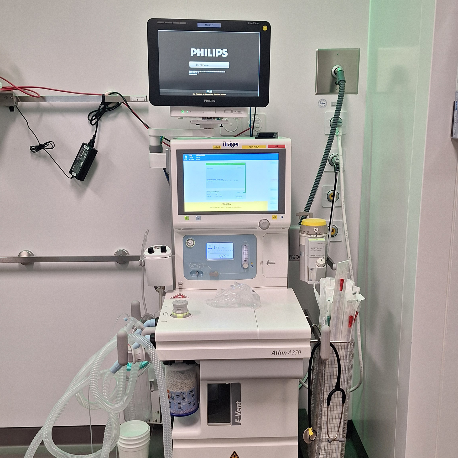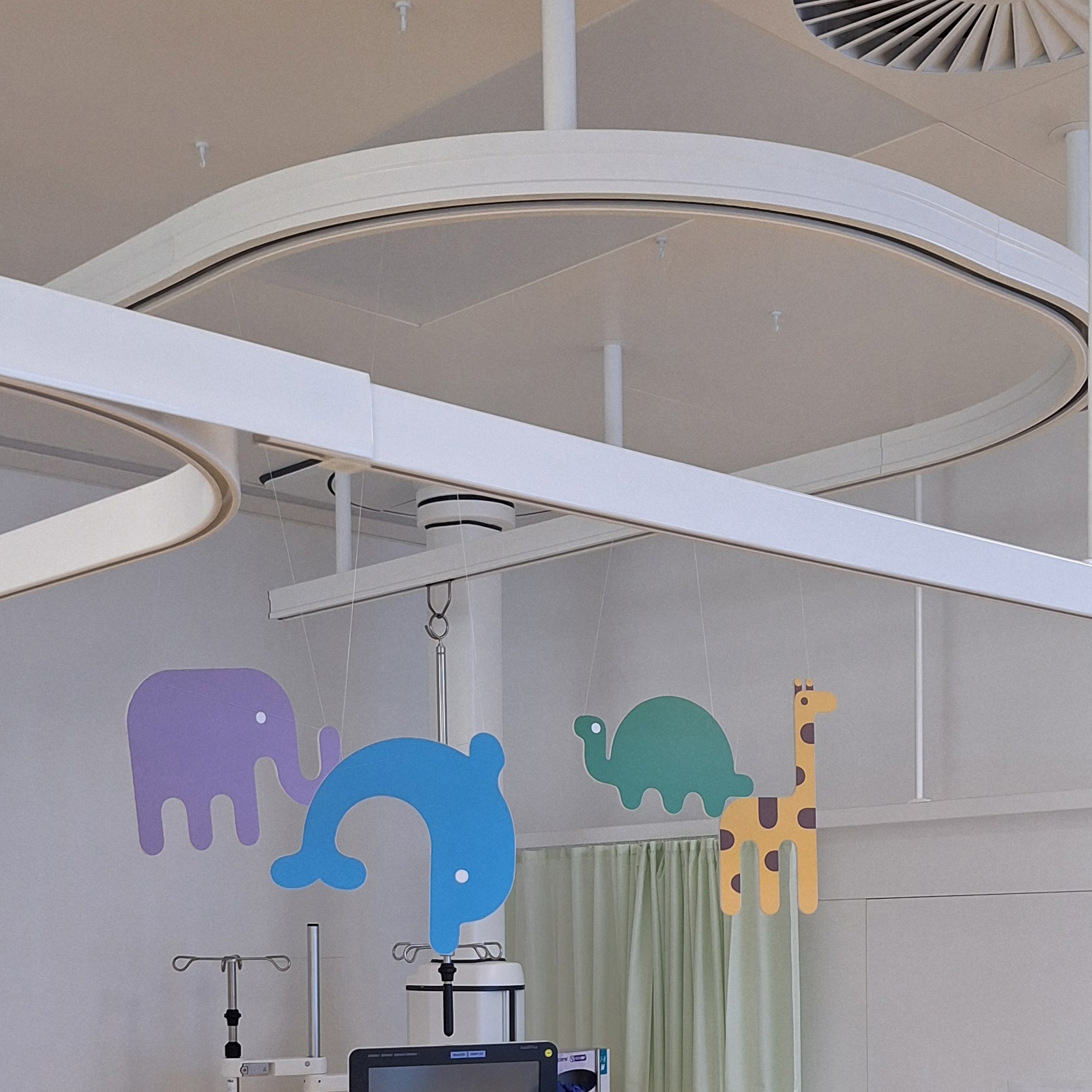 Im Vorbereitungsraum wird das Kind auf das Einschlafen vorbereitet. An der Decke läuft der Einschlafzirkus als beruhigende Ablenkung. Medizinische Geräte sind bewusst sichtbar dargestellt, um Vertrautheit zu schaffen. Dem Kind wird spielerisch vermittelt, dass es durch tiefes Einatmen versuchen kann, einen Ballon am Ende eines Schlauches aufzublasen. Ergänzend sind die Anästhesiemaske mit auswählbaren Geschmacksrichtungen, die angeschlossene Wärmedecke, markante Schränke sowie die Tür zum Operationssaal dargestellt. Der OP selbst, mit seinen markanten Lampen und Monitoren, wird nur angedeutet, da das Kind den Eingriff und diesen Raum nicht bewusst wahrnimmt. Eine freundlich winkende Ärztin oder ein Arzt signalisiert dem Kind, dass es gut aufgehoben ist.