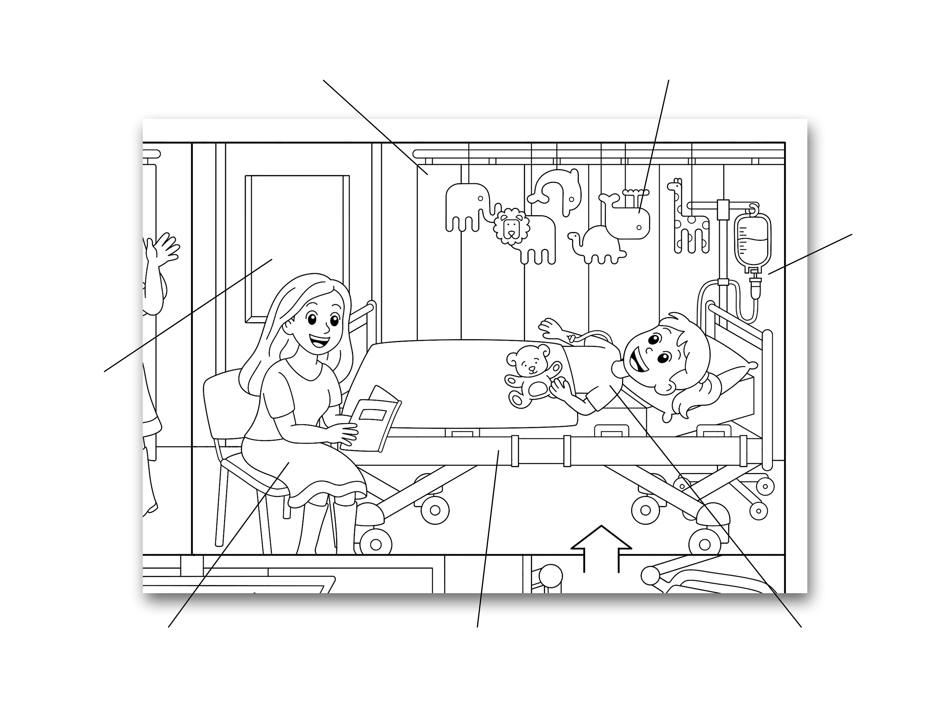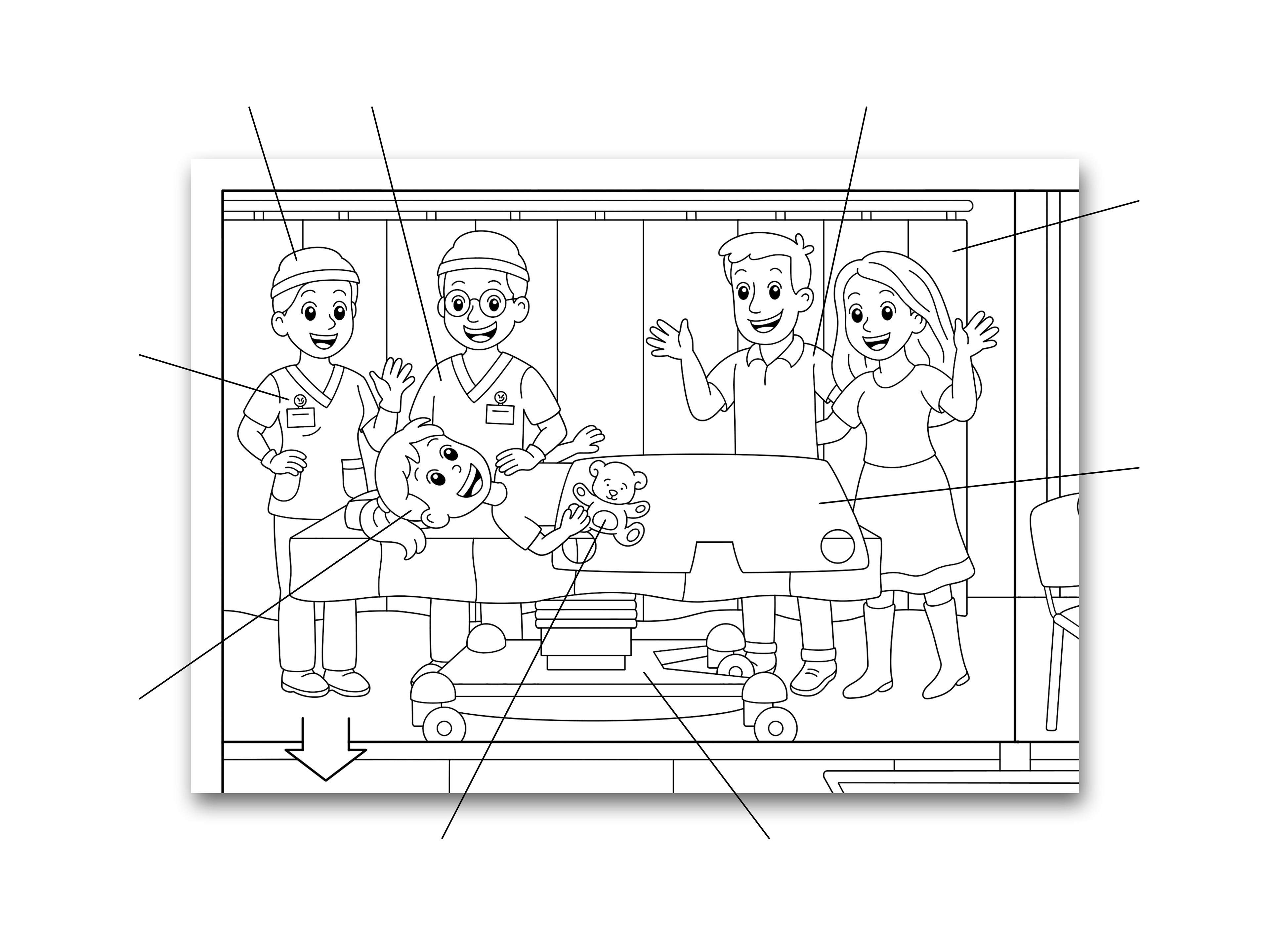 Das Ausmalbild zeigt den Ablauf einer Operation aus der Perspektive eines Kindes. In enger Abstimmung mit dem medizinischen Fachpersonal wurden jene Räume, Personen und Objekte definiert, die für Kinder während des Prozesses eine zentrale Rolle spielen. Ziel war es, durch Wiedererkennung und spielerische Auseinandersetzung Vertrauen und Sicherheit zu vermitteln.
