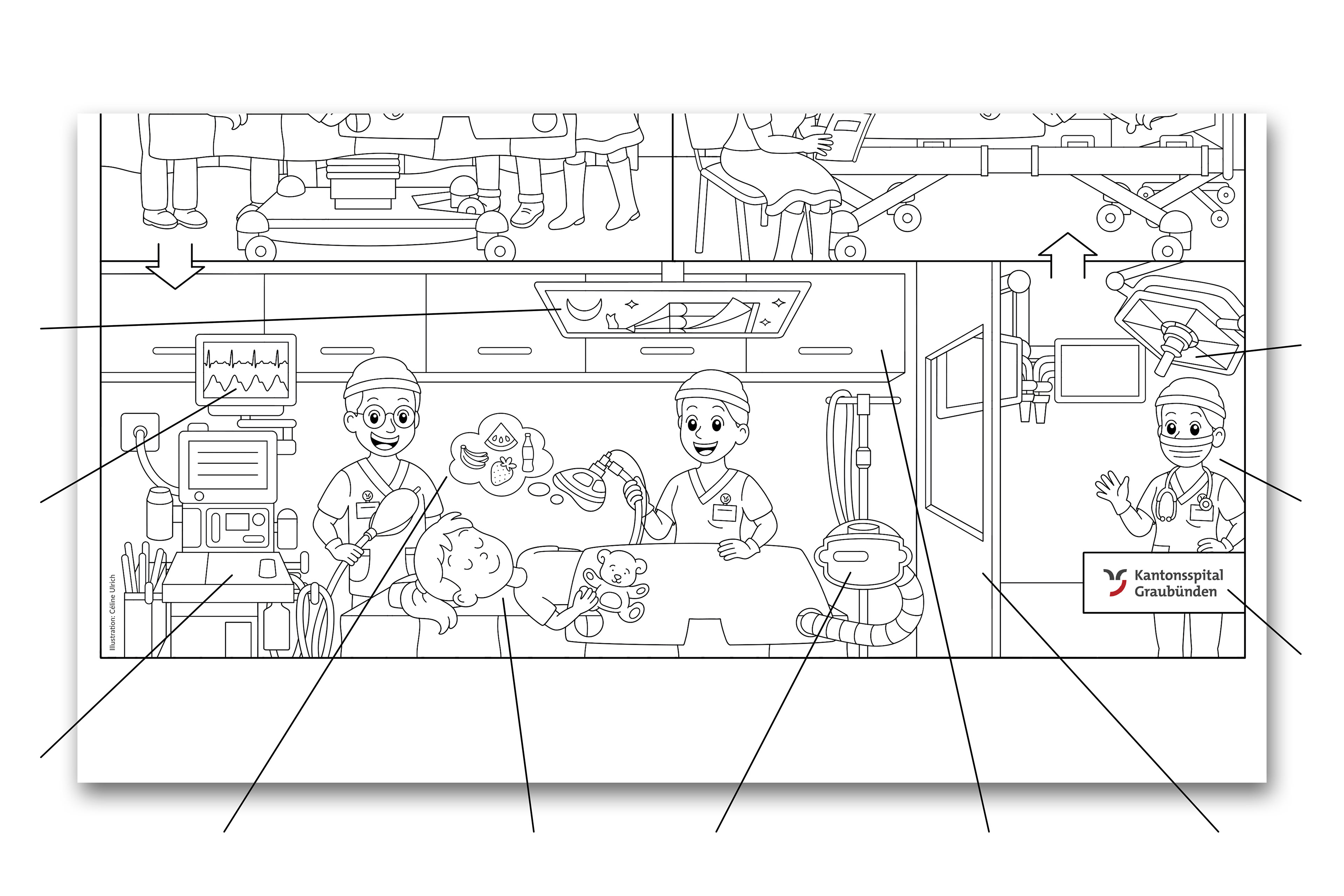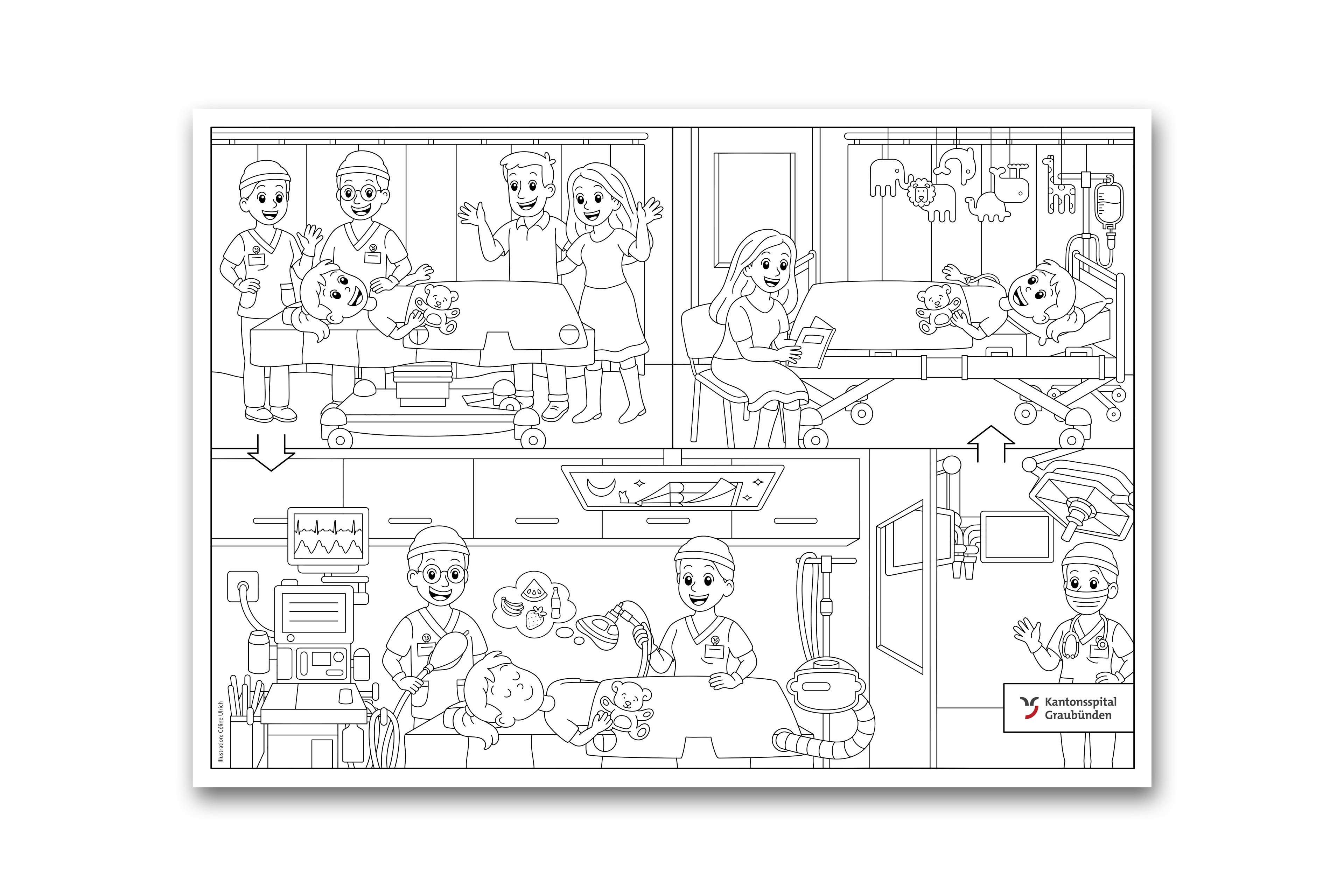 Das Kantonsspital Graubünden ist das zentrale Akutspital des Kantons und versorgt Patientinnen und Patienten aus der gesamten Region in einem breiten medizinischen Spektrum. Einen besonderen Stellenwert nimmt dabei auch die kindgerechte Betreuung ein. Für die Kindersprechstunde des Kantonsspitals Graubünden durfte ich ein Ausmalbild gestalten, das Kinder auf eine bevorstehende Operation vorbereitet und ihnen hilft, Ängste abzubauen.