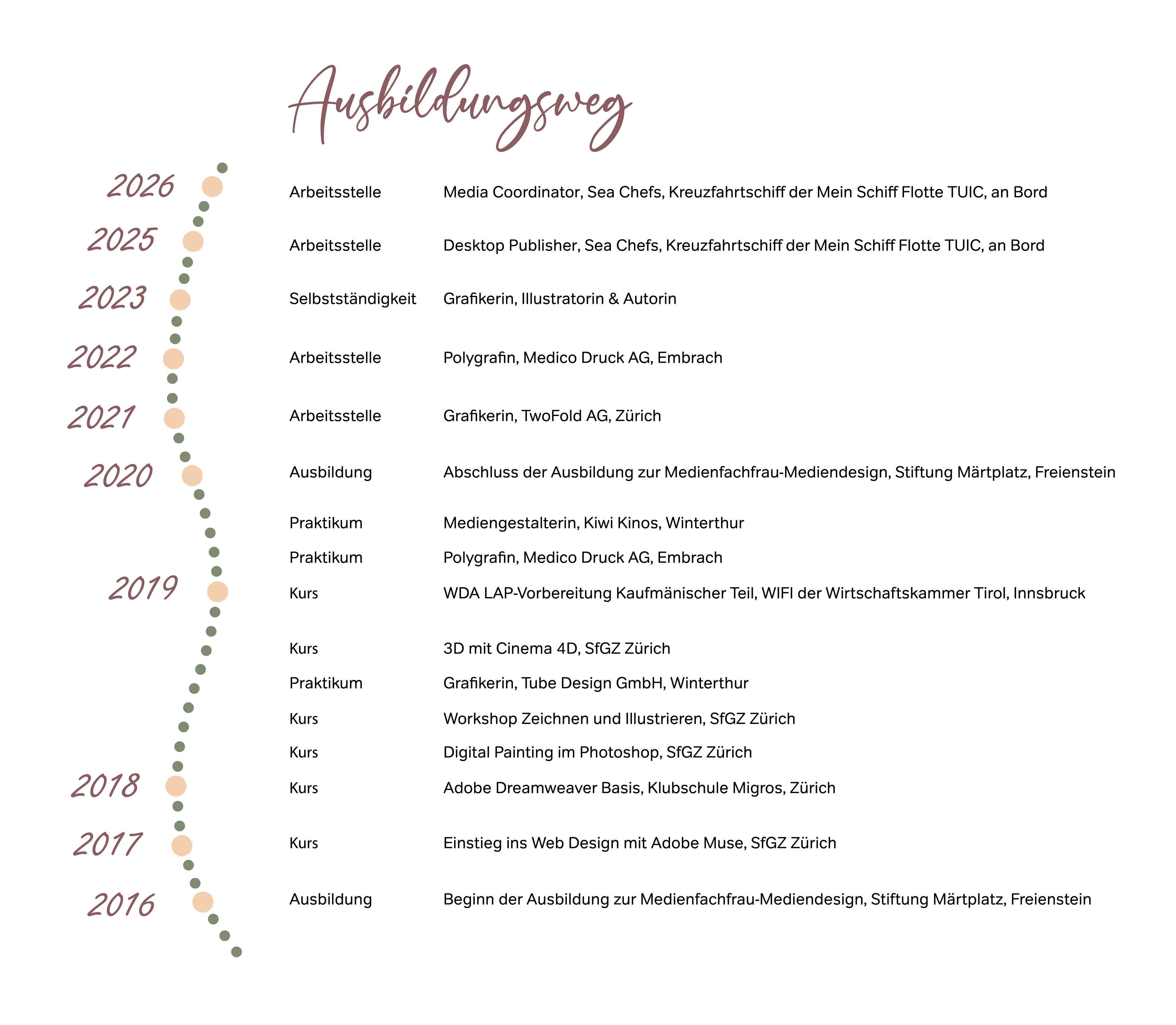 Anfang 2020 habe ich erfolgreich meine Ausbildung zur Mediendesignerin abgeschlossen – ein Beruf, der mich seitdem mit grosser Freude und Begeisterung begleitet. Kreativität ist für mich nicht nur eine Fähigkeit, sondern eine Art zu denken: offen, neugierig und stets auf der Suche nach neuen Lösungen.